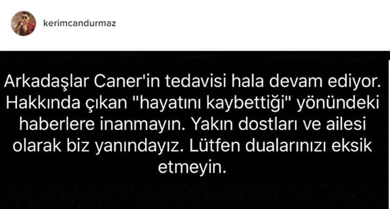 "Arkadaşlar Caner'in tedavisi hala devam ediyor. Hakkında çıkan 'hayatını kaybettiği' yönündeki haberlere inanmayın. Yakın dostları ve ailesi olarak biz yanındayız. Lütfen dualarınızı eksik etmeyin. "