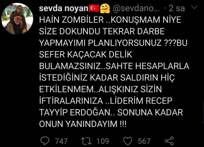 Konuşmam niye size dokundu tekrar darbe yapmayı mı planlıyorsunuz? Bu sefer kaçacak delik bulamazsınız. Sahte hesaplarla istediğiniz kadar saldırın, hiç etkilenmem. Alışkınız sizin iftiralarınıza… Liderim Recep Tayyip Erdoğan… Sonuna kadar onun yanındayım.