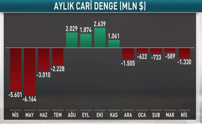 Buna göre cari işlemler açığı, nisanda geçen yılın aynı ayına kıyasla 4 milyar 263 milyon dolar azalarak 1 milyar 334 milyon dolar olarak gerçekleşti. Beklenti 1.50 milyar dolardı. Bunun sonucunda, 12 aylık cari işlemler açığı 8 milyar 634 milyon dolara geriledi.