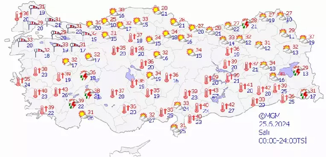 Meteoroloji tarafından 25 Haziran hava durumu tahminleri açıklandı. Mevsim normalleri üzerinde seyreden hava sıcaklıklarının, Çarşamba günü biraz azalacağı ancak mevsim normalleri üzerinde seyretmeye devam edeceği tahmin ediliyor. Yapılan son tahminlere göre, ülkemizin iç ve doğu kesimlerinin parçalı, yer yer çok bulutlu, Ege’nin doğusu, Batı Akdeniz’in iç kesimleri, Doğu Anadolu’nun güneydoğusu, Rize ve Artvin kıyıları ile Ordu, Giresun ve Trabzon’un iç kesimlerinin yerel sağanak ve gök gürültülü sağanak yağışlı, diğer yerlerin az bulutlu ve açık geçeceği tahmin ediliyor. Rüzgârın, Marmara ile Kıyı Ege’de kuzeyli yönlerden kuvvetli (40-60 km/saat) esmesi bekleniyor.
