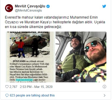 Çavuşoğlu, Twitter hesabında "Everest'te mahsur kalan vatandaşlarımız Muhammed Emin Özyazıcı ve Muratcan Kaya'yı helikopterle dağdan aldık. Uçakla en kısa sürede ülkemize getireceğiz." paylaşımını yaptı.