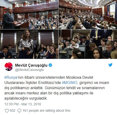 MGIMO öğrencilerine hitap eden Çavuşoğlu, "Türkiye NATO üyesi ancak biz bağımsız bir ülkeyiz. İttifakın diğer ülkeleri, NATO dışındaki ülkelerden silah alabiliyor. Biz de bu hakka ve özgürlüğe sahibiz" dedi.