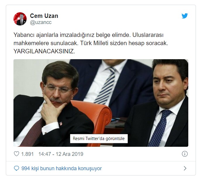 Uzan, "Yabancı ajanlarla imzaladığınız belge elimde. Uluslararası mahkemelere sunulacak. Türk Milleti sizden hesap soracak. Yargılanacaksınız" dedi.