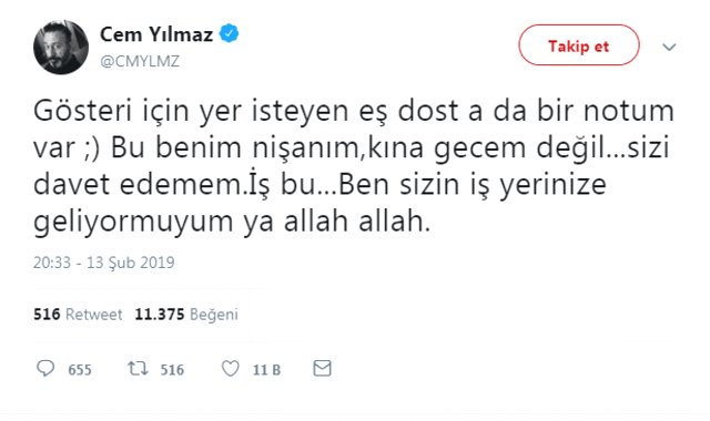 Komedyen Cem Yılmaz'ın yeni stand-up gösterisinin biletleri satışa sunulduğu gün tükenmişti. Ünlü komedyen, gösterisi için bilet talep eden kişilere komik bir dille tepki gösterdi. Twitter hesabından açıklama yapan Cem Yılmaz, "Gösteri için yer isteyen eş dosta da bir notum var. Bu benim nişanım, kına gecem değil...Sizi davet edemem. İş bu...Ben sizin iş yerinize geliyor muyum ya?" ifadelerini kullandı.