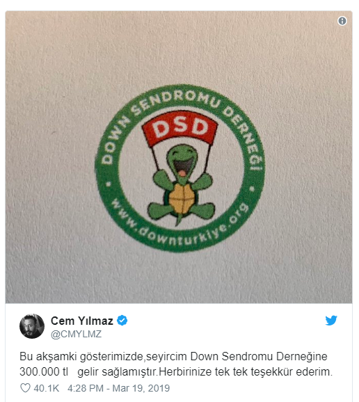 Yılmaz, gösterisinin geliriyle bağışta bulunduğunu belirterek, 'Bu akşamki gösterimizde,seyircim Down Sendromu Derneği'ne 300.000 TL gelir sağlamıştır. Her birinize tek tek teşekkür ederim.' dedi.