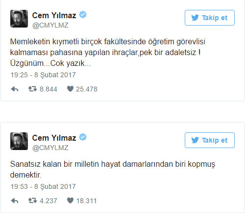 Cem Yılmaz, resmi Twitter hesabından yaptığı paylaşımda, "Memleketin kıymetli birçok fakültesinde öğretim görevlisi kalmaması pahasına yapılan ihraçlar,pek bir adaletsiz ! Üzgünüm...Cok yazık..." ifadesini kullandı.