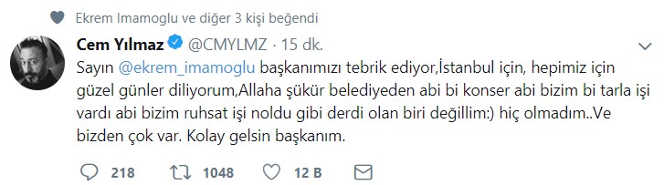 Cem Yılmaz yaptığı paylaşımda "Sayın Ekrem İmamoğlu başkanımızı tebrik ediyor,İstanbul için, hepimiz için güzel günler diliyorum,Allaha şükür belediyeden abi bi konser abi bizim bi tarla işi vardı abi bizim ruhsat işi noldu gibi derdi olan biri değillim:) hiç olmadım..Ve bizden çok var. Kolay gelsin başkanım." ifadelerini kullandı.