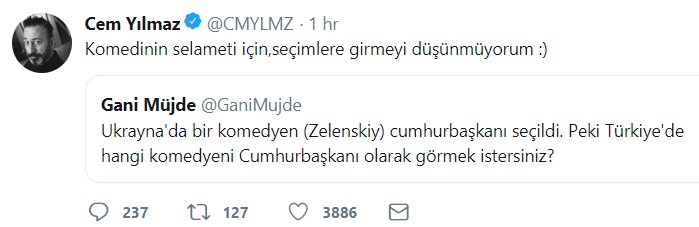 Ukrayna'da seçimleri kazanan Zelenskiy'in cumhurbaşkanı olmasının yankıları sürerken ünlü mizah yazarı Gani Müjde "Ukrayna'da bir komedyen (Zelenskiy) cumhurbaşkanı seçildi. Peki Türkiye'de hangi komedyen Cumhurbaşkanı olarak görmek istersiniz?" diye sordu.