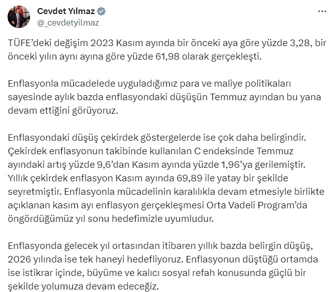 Cumhurbaşkanı Yardımcısı Cevdet Yılmaz, Türkiye İstatistik Kurumu (TÜİK)'in kasım ayına ilişkin Tüketici Fiyat Endeksi (TÜFE) verisini açıklaması sonrası enflasyona dair sosyal medya hesabından değerlendirmelerde bulundu.