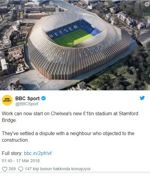 Chelsea'nin 500 milyon euro'ya mal olacak yeni stat projesinin önündeki en önemli engel kalktı. Crosthwaite ailesi projeye oturdukları evin güneş ışığını keseceği gerekçesiyle onay vermiyor ve 20 milyon Pound talep ediyordu. İngiliz basını ailenin ikna edildiğini ve projeye vetoyu kaldırdığını yazarken, anlaşmanın nasıl sağlandığı açıklanmadı.