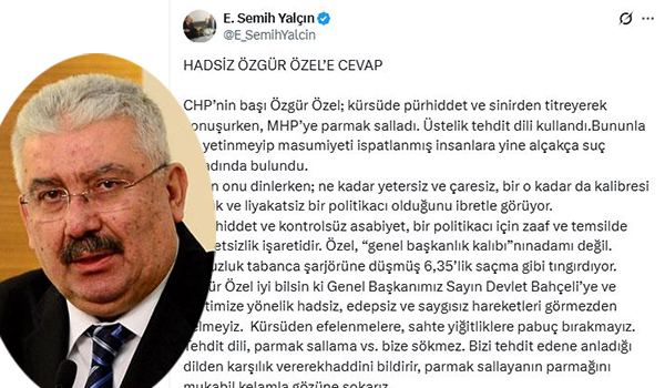 Genel Başkanları ve partilerine yönelik edepsiz ve saygısız hareketleri görmezden gelemeyeceklerini belirten Semih Yalçın, "Özgür Özel iyi bilsin ki Genel Başkanımız Sayın Devlet Bahçeli'ye ve partimize yönelik hadsiz, edepsiz ve saygısız hareketleri görmezden gelmeyiz. Kürsüden efelenmelere, sahte yiğitliklere pabuç bırakmayız. Tehdit dili, parmak sallama vesaire bize sökmez. Bizi tehdit edene anladığı dilden karşılık vererek haddini bildirir, parmak sallayanın parmağını mukabil kelamla gözüne sokarız. Özgür efendi, sürekli topu taca atacağına, CHP'li belediyelerin mali kanallarını kirli para ve rüşvet kanalizasyonuna çeviren hırsızları, parti içindeki hasımlarından önce bizzat ifşa edip temizlesin. Özgür Özel'in milli iradeden dem vurması da pek gülünç. Kayyum atanan veya soruşturma altındaki CHP'li belediyelerde milli iradenin yerini 'kayme iradesi'nin aldığı çoktan ayyuka çıktı. Özel'in bize 'Hodri meydan' demesini ciddiye bile almıyor, 'Hadi oradan hadi oradan' diyoruz" ifadelerine yer verdi.