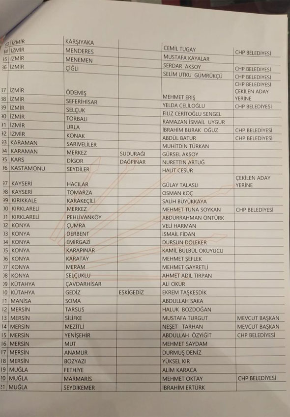 Torun'un yaptığı açıklamada açıkladığı belediye başkan adayları şöyle: