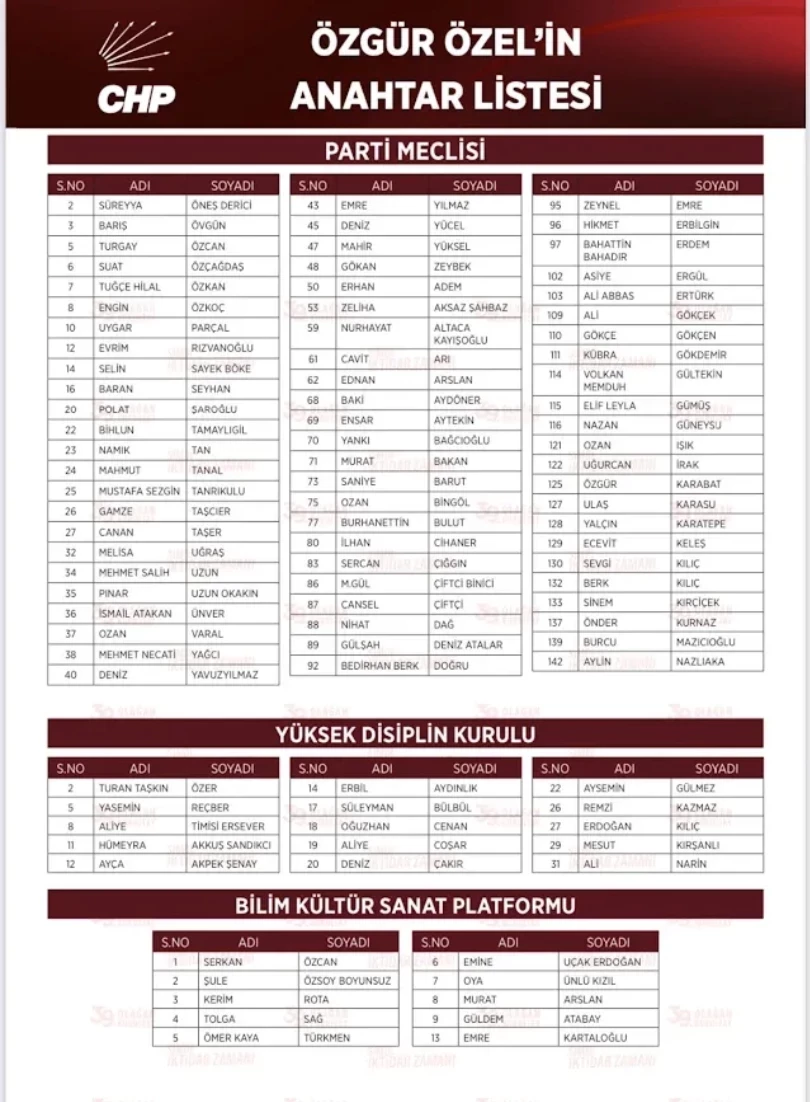 Dördüncü kez CHP Genel Başkanı seçilen Özgür Özel'in hazırladığı anahtar liste netleşti. Mevcut MYK üyelerinin tamamı A takımındaki yerini aldı, Parti Meclisi'ndeki 49 kişi yerini korudu. Ana muhalefet lideri, 32 yeni isme yer verdi.