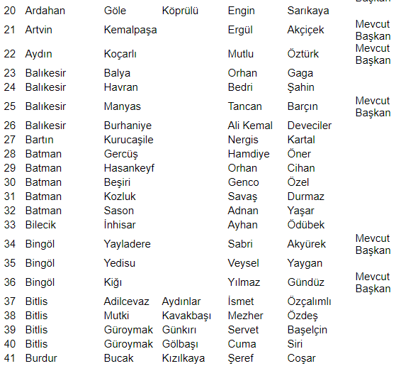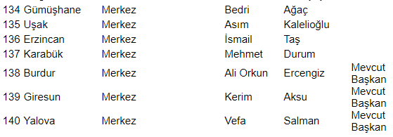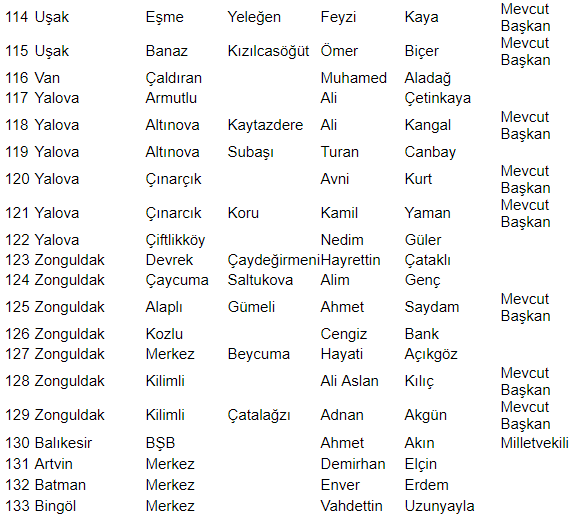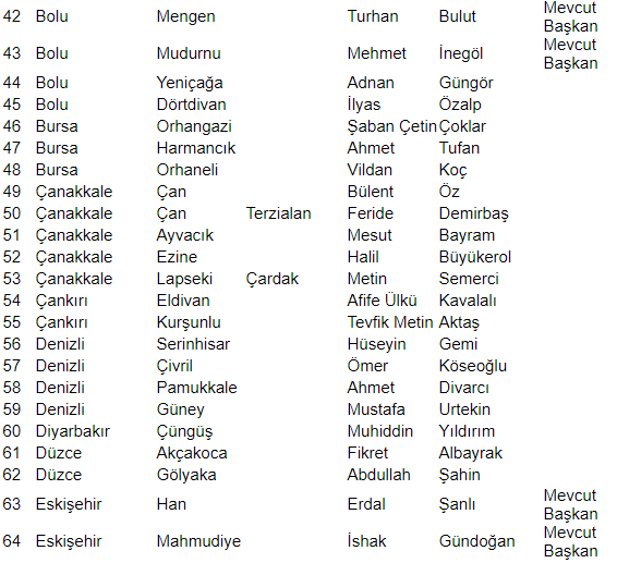 Sabah 09.00'da toplanan Merkez Yönetim Kurulu'nun aday listesi PM'de kabul edildi. Listeye göre, CHP'nin yönetimde olduğu; Yalova'da Vefa Salman, Burdur'da Ali Orkun Ercengiz ve Giresun'da Kerim Aksu'nun yeniden aday gösterilmesine karar verildi.