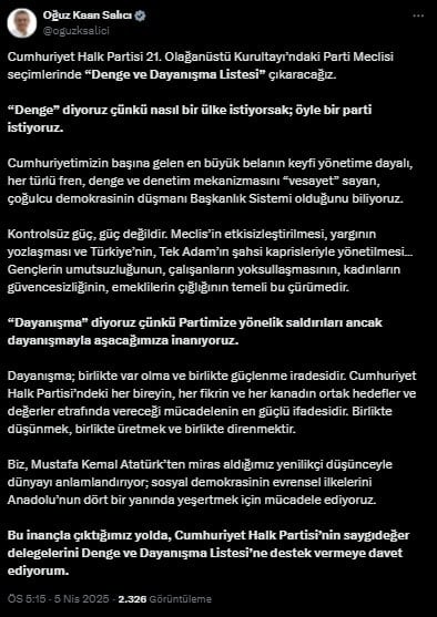 "Cumhuriyet Halk Partisi 21. Olağanüstü Kurultayı’ndaki Parti Meclisi seçimlerinde “Denge ve Dayanışma Listesi” çıkaracağız. “Denge” diyoruz çünkü nasıl bir ülke istiyorsak; öyle bir parti istiyoruz. Cumhuriyetimizin başına gelen en büyük belanın keyfi yönetime dayalı, her türlü fren, denge ve denetim mekanizmasını “vesayet” sayan, çoğulcu demokrasinin düşmanı Başkanlık Sistemi olduğunu biliyoruz. Kontrolsüz güç, güç değildir. Meclis’in etkisizleştirilmesi, yargının yozlaşması ve Türkiye’nin, Tek Adam’ın şahsi kaprisleriyle yönetilmesi… Gençlerin umutsuzluğunun, çalışanların yoksullaşmasının, kadınların güvencesizliğinin, emeklilerin çığlığının temeli bu çürümedir. “Dayanışma” diyoruz çünkü Partimize yönelik saldırıları ancak dayanışmayla aşacağımıza inanıyoruz. Dayanışma; birlikte var olma ve birlikte güçlenme iradesidir. Cumhuriyet Halk Partisi’ndeki her bireyin, her fikrin ve her kanadın ortak hedefler ve değerler etrafında vereceği mücadelenin en güçlü ifadesidir. Birlikte düşünmek, birlikte üretmek ve birlikte direnmektir. Biz, Mustafa Kemal Atatürk’ten miras aldığımız yenilikçi düşünceyle dünyayı anlamlandırıyor; sosyal demokrasinin evrensel ilkelerini Anadolu’nun dört bir yanında yeşertmek için mücadele ediyoruz. Bu inançla çıktığımız yolda, Cumhuriyet Halk Partisi’nin saygıdeğer delegelerini Denge ve Dayanışma Listesi’ne destek vermeye davet ediyorum."