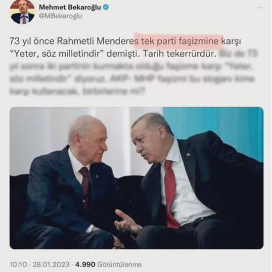 CHP İstanbul Milletvekili Mehmet Bekaroğlu, Twitter hesabından yaptığı paylaşımla, partisini 'faşist' olarak niteledi. "73 yıl önce Rahmetli Menderes tek parti faşizmine karşı..." diyerek devam eden bir paylaşım yapan Bekaroğlu, gelen tepkilerin ardından tweetini sildi.