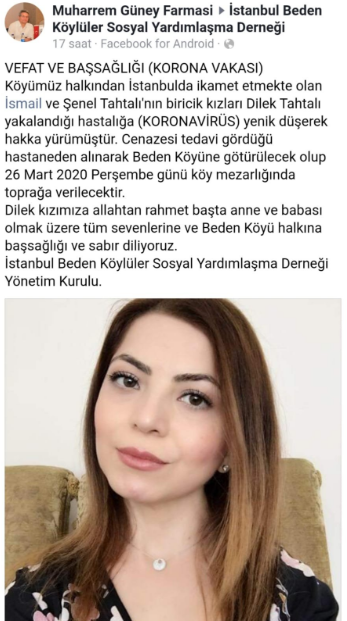 Dilek Tahtalı’nın vefatı sonrası, cenazesinin memleketi Amasya’da Beden Köyü’nde yarın (26 Mart Perşembe) defnedileceği ve ölümünün corona virüsünden olduğunu duyuran İstanbul Beden Köylüler Sosyal Yardımlaşma Derneği tarafından sosyal medyada şu paylaşım yapıldı: