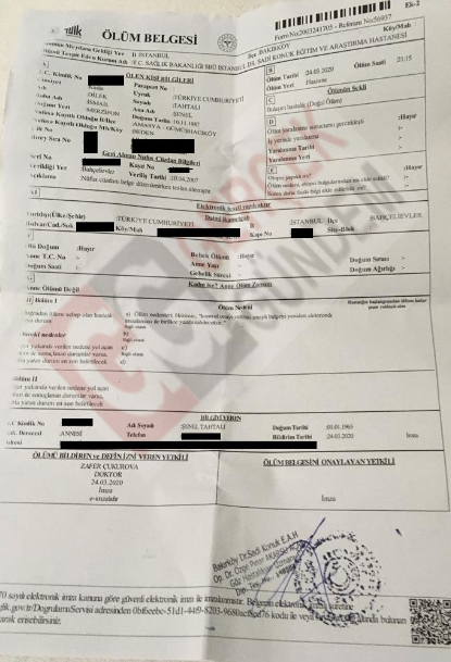 Bakırköy Dr. Sadi Konuk Eğitim Araştırma Hastanesi tarafından düzenlenen ölüm belgesine “Bulaşıcı Hastalık (Doğal Ölüm)” yazıldı.