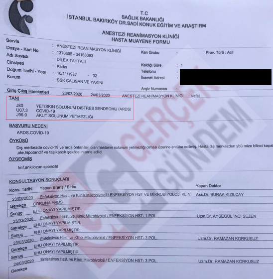 Dr. Sadi Konuk Eğitim Araştırma Hastanesi tarafından düzenlenen hastane muayene formunda, 23 Mart 2020 tarihinde 33 yaşındaki Dilek Tahtalı için korona virüs (Kovid-19) tanısı konulmuştu.