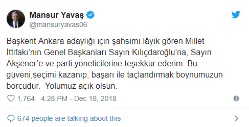 Başkent Ankara adaylığı için şahsımı lâyık gören Millet İttifakı’nın Genel Başkanları Sayın Kılıçdaroğlu’na, Sayın Akşener’e ve parti yöneticilerine teşekkür ederim. Bu güveni,seçimi kazanıp, başarı ile taçlandırmak boynumuzun borcudur. Yolumuz açık olsun. Allah’ın izni, halkımızın takdiriyle Cumhuriyetimizin kalbi Güzel Ankara’ya hizmetkar olmaya talibim. Parti ayrımı yapmaksızın tüm Ankaralılara teşekkürlerimi ve şükranlarımı sunuyorum.