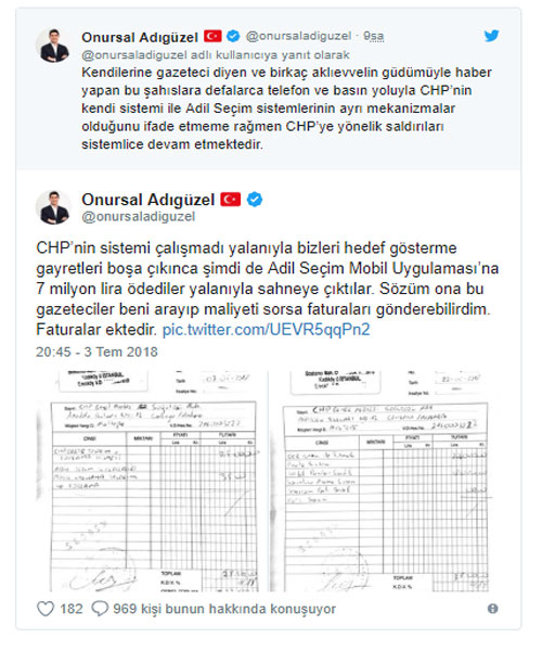 CHP Genel Başkan Yardımcısı Onursal Adıgüzel, partisinin Adil Seçim Platformu'na 7 milyon lira ödediği iddiasına Twitter'dan "faturalı" yanıt verdi. Ancak Adıgüzel'in verdiği yanıttan ziyade bir bilişim firmasının el yazısıyla fatura tanzim etmesi yankı buldu. Çok sayıda Twitter kullanıcısı fatura ile ilgili esprili mesajlarla Adıgüzel'e yanıt verdi. İşte o yorumlardan bazıları: