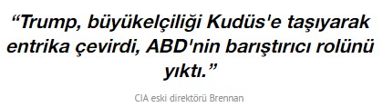 ABD'de eski Merkezi Haberalma Teşkilatı Başkanı (CIA) John Brennan, Gazze'deki ölümlerin, ABD Başkanı Donald Trump ve İsrail Başbakanı Binyamin Netanyahu'nun Filistinlilerin haklarına ve vatanlarına açıkça saygı göstermemelerinin sonucu olduğunu söyledi. Brennan Trump için 'Entrika çevirdi' ifadesini kullandı.