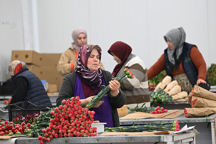 Seralardan toplanan karanfil başta olmak üzere kırmızı ağırlıklı çiçekler paketlenip, sevgililer için hazırlanıyor. Yurt dışı için tırlara yüklenen çiçekler yola çıktı, iç pazar için ise çalışmalar sürüyor.