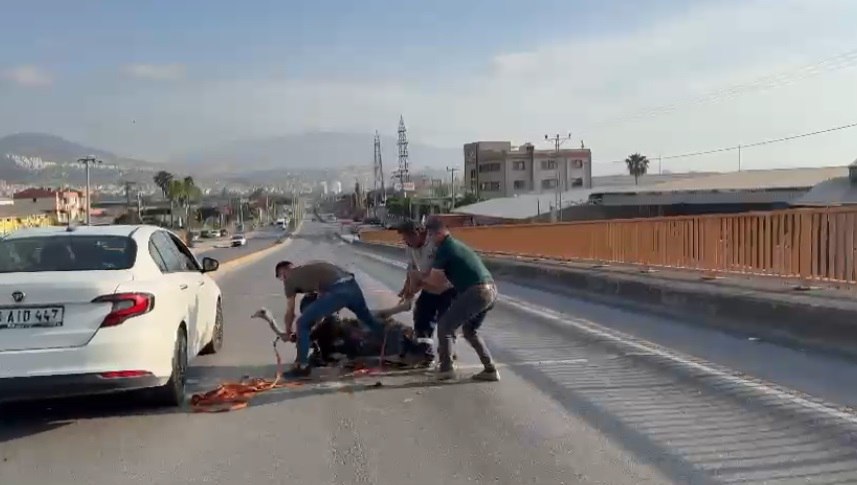 Hatay'ın İskenderun ilçesinde bir çiftlikten sabah saatlerinde kaçan deve kuşu, Profesör Muammer Aksoy Caddesi'nde araçların arasında koşmaya başladı. Deve kuşunu görünce şaşkınlık yaşayan vatandaşlar, cep telefonuyla o anları görüntüledi.