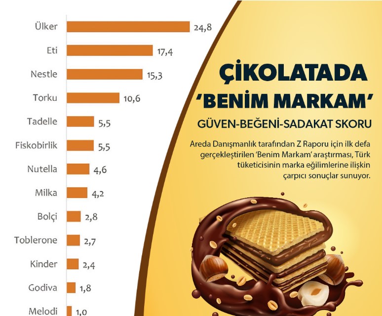Gıdada çikolatada yüzde 24,8 oranında tüketici, benim markam olarak Ülker'i işaret ediyor. Ülker'in güven, beğeni ve sadakat kriterlerinin tümünde açık ara üstünlüğünün bu kategoride öne çıkmasını sağladığını söylemek mümkün. Beğeni kriterinde Nestle'nin güven ve sadakat kriterinde ise Eti'nin Ülker'i takip ettiği görülüyor.