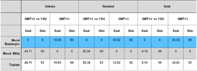 8.00 ve 17.00 saatleri arasındaki standart bir mesai günü üzerinden hesaplanan verilere göre İstanbullu bir çalışanın eski düzene kıyasla karanlıkta kaldığı gün ve saat sayısının arttığı görülüyor. Ankara’da ve daha doğuda ise hava geç karardığı için kalıcı yaz saati uygulaması eski düzene göre daha az karanlıkta kalınmasına sebep oluyor. Ancak sabah havanın geç aydınlanması nedeniyle mesai öncesinde işe, okula yetişmek için hazırlanma ve trafikte geçen süreler düşünüldüğünde bu süre tablodakilerden çok daha fazla.
