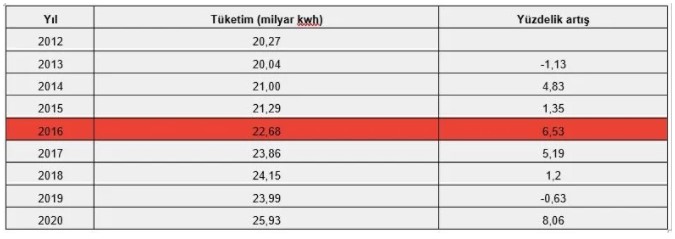 Verilere bakıldığında uygulamanın başladığı 2016 yılında anlamlı bir artış olduğu görülüyor. 2020 yılında pandemi nedeniyle gerçekleştiği tahmin edilen tüketim artışı ve lisanssız üretimin istatistiklere eklenmesi nedeniyle yaşanan büyük artış hariç bırakıldığında son 9 yıl esas alındığında en büyük tüketim artışı da 2016 yılında gerçekleşti.