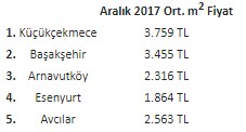 Hürriyet Emlak Aralık 2017 Emlak Endeksi verilerine göre; Küçükçekmece’de satılık konut metrekare ortalama fiyatları 3 bin 759 TL, Başakşehir’de 3 bin 455 TL, Arnavutköy’de 2 bin 316 TL, Esenyurt’ta bin 864 TL, Avcılar’da ise 2 bin 563 TL oldu.