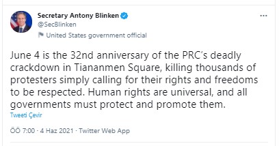Blinken, Twitter'dan yaptığı paylaşımda Çin ordusunun Tiananmen Meydanı'nda göstericileri dağıtmak amacıyla ateş açması sonucu binlerce kişinin yaşamını yitirdiği olayları anarken, "tüm hükümetlerin insan haklarını koruması gerektiğini" söylemişti.
