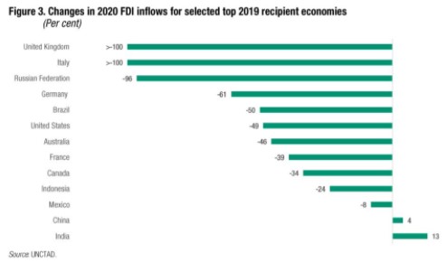 2019'da 45 milyar dolarlık yabancı doğrudan yatırım çeken Birleşik Krallık, 2020'de -1,3 milyar dolara düşerek en çok gerileyen gelişmiş ülke oldu.
