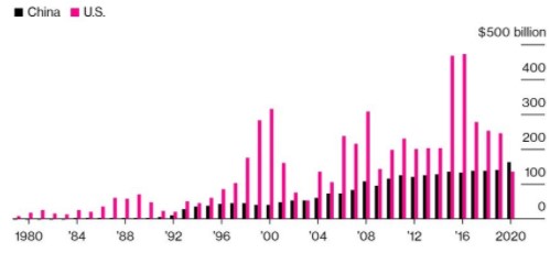Birleşmiş Milletler Ticaret ve Kalkınma Konferansı (UNCTAD) tarafından yayınlanan rapora göre, 2020'de Çin'e yabancı doğrudan yatırım girişi yıllık yüzde 4 artışla 163 milyar dolara yükselirken, ABD için bu rakam yüzde 49 azalarak 134 milyar dolara geriledi.