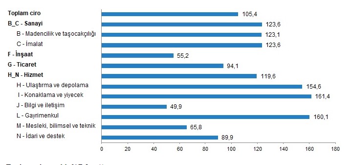 TÜİK verilerine göre, sanayi, inşaat, ticaret ve hizmet sektörleri toplamında ciro endeksi (2015=100), 2022 yılı Şubat ayında yıllık %105,4 arttı.