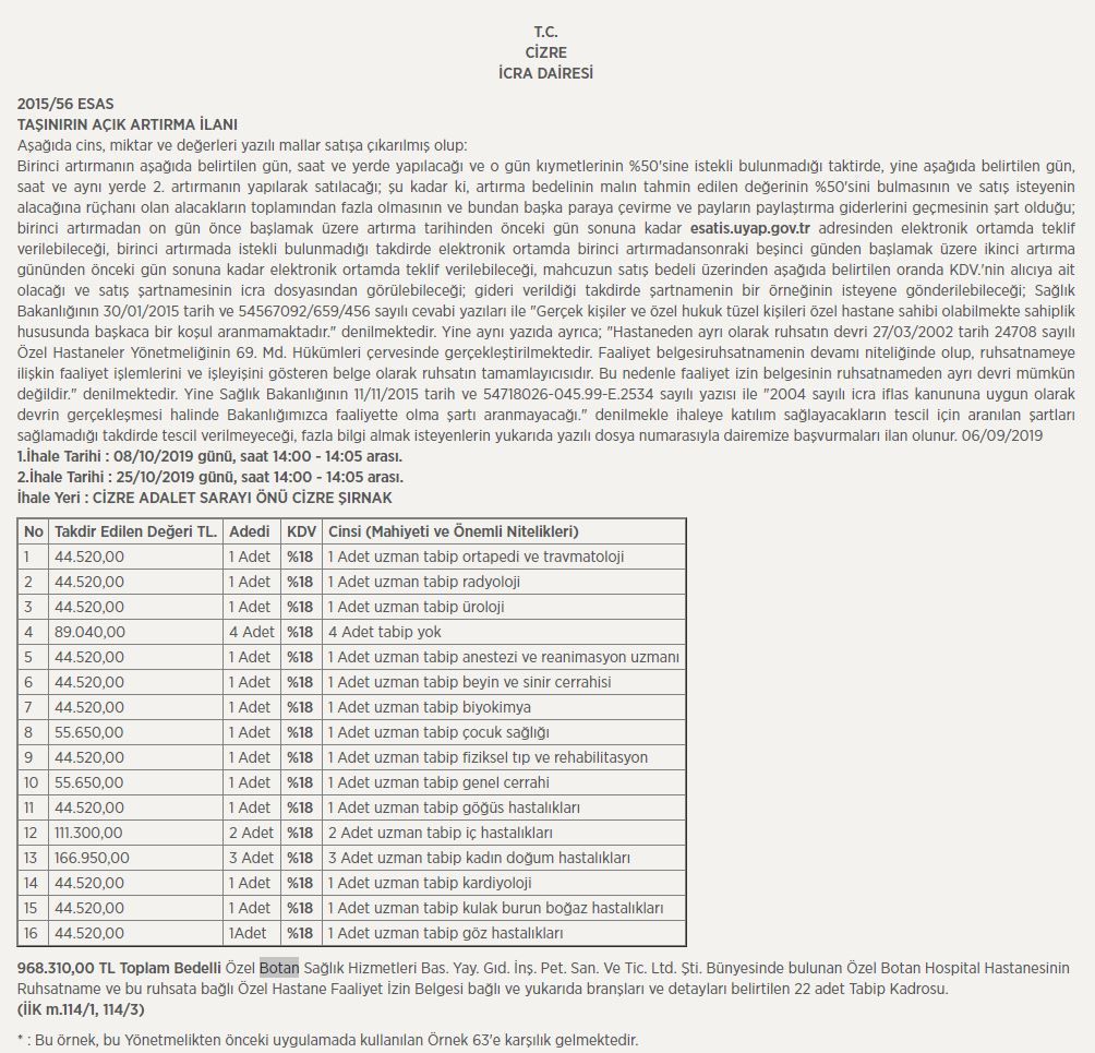 İlanda satışa çıkarılanın 'Özel Botan Hospital Hastanesi'nin ruhsatname ve bu ruhsata bağlı Özel Hastane Faaliyet İzin Belgesi bağlı ve branşları ve detayları belirtilen 22 adet Tabip Kadrosu' olduğu belirtildi.