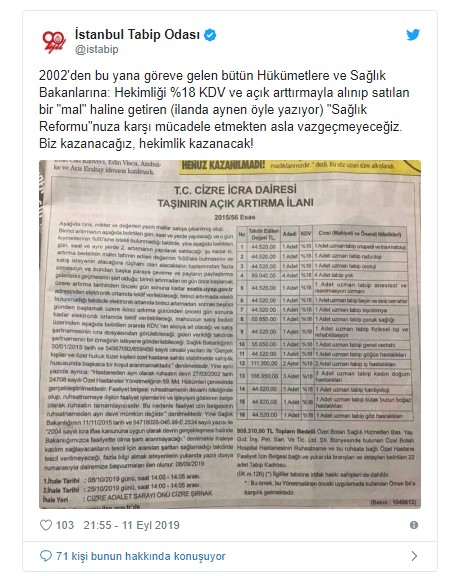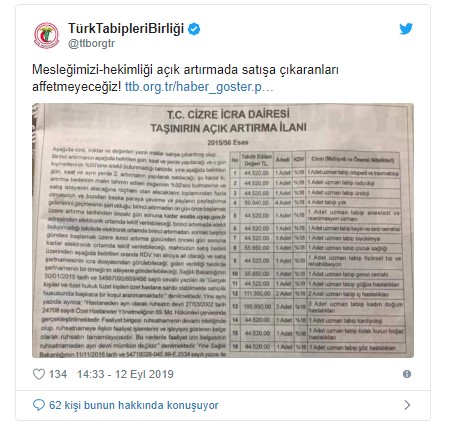 Türk Tabipler Birliği tarafından yapılan yazılı açıklamada ise "Mesleğimizi-hekimliği açık artırmada satışa çıkaranları affetmeyeceğiz" denildi.