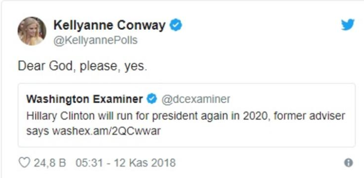 Donald Trump'ın kıdemli danışmanlarından Kellyanne Conway da makaleyi Twitter'da "Sevgili Tanrım, evet lütfen" notuyla paylaştı.