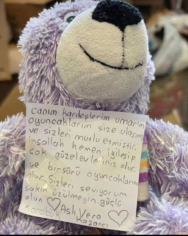Kente yaşayan 6 yaşındaki Hira Kara ise oyuncaklarının yanına üzerine kalp çizdiği bir kağıda, "Geçmiş olsun Türkiye'm. Karabük'te yaşıyorum, deprem için çok üzgünüm. 6 yaşında olduğum için sizlere en sevdiğim oyuncaklarımı gönderiyorum. Oynarken mutlu olun, sizi çok seviyorum. Allaha emanet olun." yazdı.