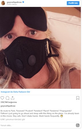 Paltrow, Fransa’nın başkenti Paris’e doğru yola çıkarken Instagram’da maskeli bir fotoğrafını paylaştı. ABD’li oyuncu “Paltrow’lar devam edecek ve uçakta bu şeyle uyuyacak. Ben daha önce bu filmdeydim. Güvende kalın. Tokalaşmayın. Sık sık ellerinizi yıkayın” dedi.