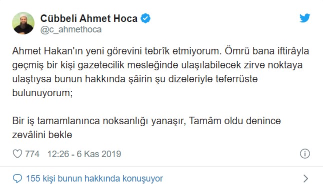 Kamuoyunda 'Cübbeli Ahmet Hoca' olarak bilinen Ahmet Mahmut Ünlü, Hürriyet Gazetesi Genel Yayın Yönetmenliği görevine getirilen Ahmet Hakan ile ilgili olarak bir kişisel Twitter hesabında paylaşımda bulundu.