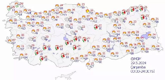 Meteoroloji tarafından yapılan son değerlendirmelere göre, ülkemiz genelinin parçalı yer yer çok bulutlu, Marmara’nın kuzeyi, Batı Akdeniz'in iç kesimleri ile Toroslar Mevkii, İç Anadolu'nun kuzeydoğusu ile güney kesimleri, Batı Karadeniz'in doğusu ve Orta Karadeniz ile Doğu Karadeniz'in kıyı illeri, Ardahan, Kars ve Hakkari çevrelerinin yerel sağanak ve gök gürültülü sağanak yağışlı geçeceği tahmin ediliyor. Çorum, Tokat, Amasya, Samsun, Ordu ve Yozgat'ta beklenen yağışların yer yer kuvvetli olması bekleniyor.