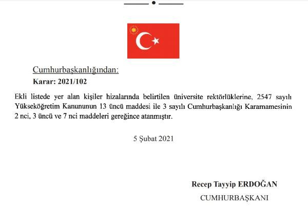 Söz konusu karara göre; Ağrı İbrahim Çeçen Üniversitesi Rektörlüğüne Prof. Dr. Abdulhalik Karabulut, Ardahan Üniversitesi Rektörlüğüne Prof. Dr. Mehmet Biber, Artvin Çoruh Üniversitesi Rektörlüğüne Prof. Dr. Mustafa Sıtkı Bilgin, Batman Üniversitesi Rektörlüğüne Prof. Dr. İdris Demir, Bitlis Eren Üniversitesi Rektörlüğüne Prof. Dr. Necmettin Elmastaş, Gümüşhane Üniversitesi Rektörlüğüne Prof. Dr. Halil İbrahim Zeybek, Hakkari Üniversitesi Rektörlüğüne Prof. Dr. Ömer Pakiş, Karamanoğlu Mehmetbey Üniversitesi Rektörlüğüne Prof. Dr. Namık Ak, Kırklareli Üniversitesi Rektörlüğüne Prof. Dr. Bülent Şengörür, Kilis 7 Aralık Üniversitesi Rektörlüğüne Prof. Dr. Mustafa Doğan Karacoşkun ve Osmaniye Korkut Ata Üniversitesi Rektörlüğüne Prof. Dr. Turgay Uzun atandı.