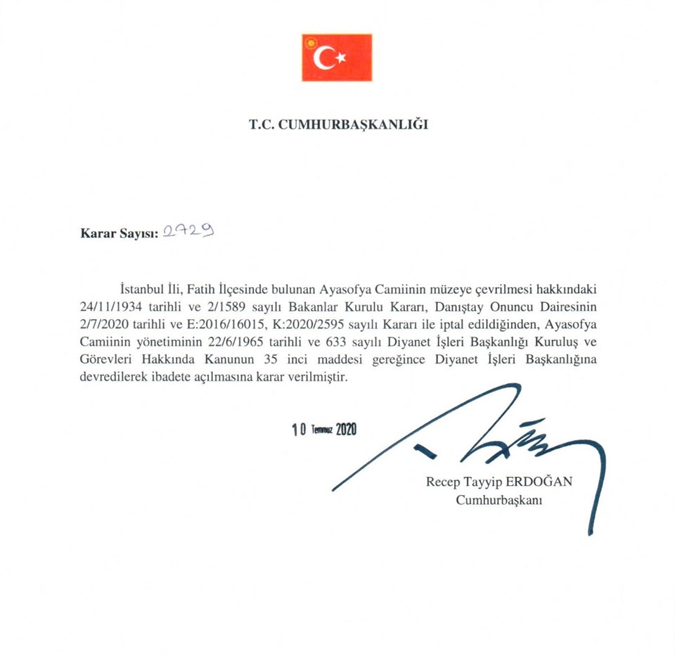 Karardan kısa bir süre sonra bir kararname yayınladı. Cumhurbaşkanı Recep Tayyip Erdoğan imzalı kararnamede Ayasofya'nın Diyanet İşleri Başkanlığı'na devredilerek ibadete açılmasına yönelik karar alındığı belirtildi.