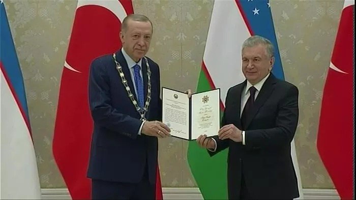 Bu nişanı ülkelerimiz arasındaki ezeli ve ebedi kardeşliğin güçlü bir sembolü olarak kabul ediyorum. Tabii kendisiyle ilk tanıştığım andan itibaren özellikle İmam Buhari'den birçok başlıkları tarafıma naklettiğinde ben hakikaten Şevket Mirziyoyev kardeşime farklı bir muhabbet beslemiştim. Tabii şimdi İmam Buhari adına üniversitenin burada kuruluyor olması gerçekten İslam dünyasına da çok farklı bir mesaj olacaktır. Bugün zaten bir heyet Türkiye'den oğlum da dahil olmak üzere İbn-i Haldun Üniversitesi'nden arkadaşlar Taşkent'e gelmişler, orada çalışma yapmışlardır. Önce insan anlayışıyla gerçekleştirilen bu reformlarla devlet adamlığını gösteren aziz kardeşim Şevket Mirziyoyev'e bu nişan vesilesiyle şükranlarımı sunuyorum.