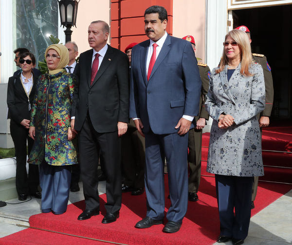 Cumhurbaşkanı Recep Tayyip Erdoğan, resmi temaslarda bulunmak üzere geldiği Caracas'taki Miraflores Sarayı'nda Venezuela Devlet Başkanı Nicolas Maduro tarafından resmi törenle karşılandı.