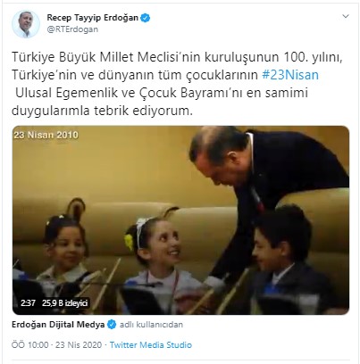 Cumhurbaşkanı Recep Tayyip Erdoğan Twitter hesabından yaptığı paylaşımda, "Türkiye Büyük Millet Meclisi’nin kuruluşunun 100. yılını, Türkiye’nin ve dünyanın tüm çocuklarının #23Nisan Ulusal Egemenlik ve Çocuk Bayramı’nı en samimi duygularımla tebrik ediyorum." ifadelerine yer verdi.
