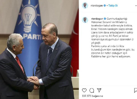 "Cumhurbaşkanlığı Hükümet Sistemi'nin milletimiz tarafından kabul edilmesiyle birlikte, Binali Yıldırım kardeşim başta olmak üzere tüm dava arkadaşlarımın sahip çıktığı yuvamız AK Parti'ye tekrar resmen üye oluşumuzun üzerinden 3 yıl geçti. Partimiz çatısı altında birlikte bulunduğum tüm kardeşlerim gibi bu davanın neferi olduğum için Rabbime her gün hamd ediyorum."
