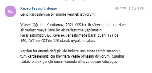 Cumhurbaşkanı Erdoğan, mesajında, "Yapılan bu önemli değişiklikle birlikte üniversite tercih sürecinin tüm kardeşlerimiz için hayırlara vesile olmasını diliyorum. Cumhur İttifakı olarak gençlerimizin yanında olmaya devam edeceğiz" sözlerine de yer verdi.